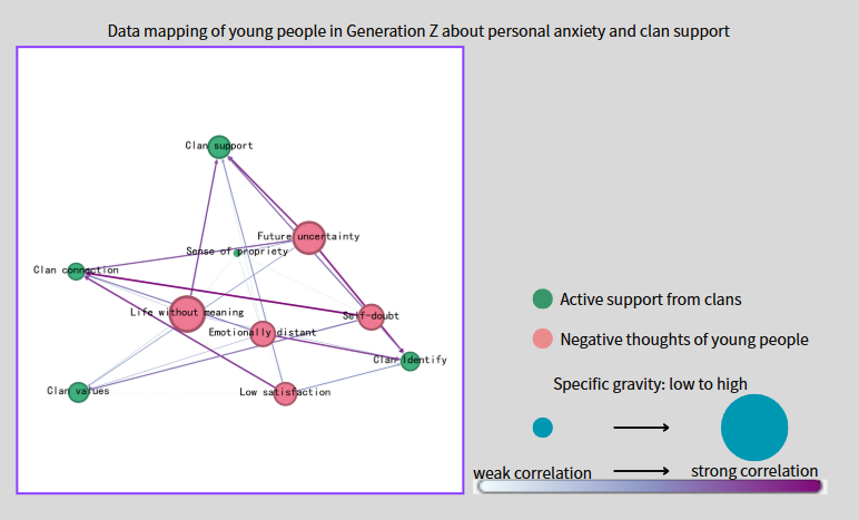 This is an in-depth interview with them, visualized based on Gephi’s sentiment analysis. This is because the people interviewed are all located in medium to large cities in China and are aged 22-30 years old, unmarried, without property or cars, and starting out in their careers. The icon sizes of the negative emotions represented by the purple color and the family support represented by the green color show that the atomized society (i.e., families that do not live with parents and children) makes it increasingly difficult to communicate and help family members in a timely manner, and without enough money to go for psychological interventions, many psychological problems cannot be solved well. As can be seen by the arrows, family interventions are negatively correlated with psychological problems. It shows that family intervention has a better performance in resolving psychological negativity.