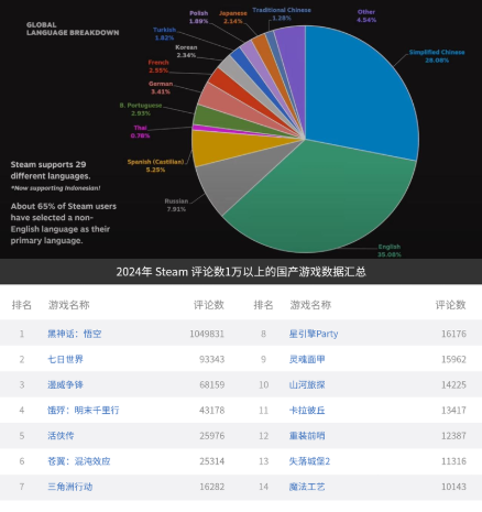 Combined with the 2024 Steam data report, Chinese games occupy about 30% of the market. Platinum level sales game has “Black Myth: Wukong”, gold level has “Eternal Hijacking Infernal”, although the proportion is not large, but still proves that Chinese culture related games are market recognition.