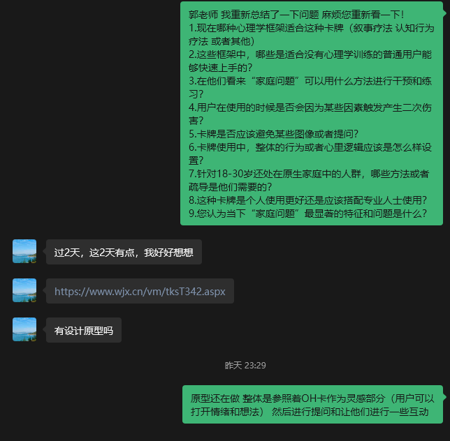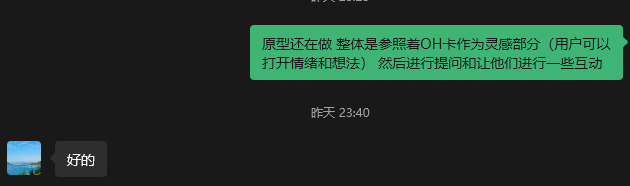 The prototype is still in development. The overall design draws inspiration from OH Cards (where users can express emotions and thoughts), then prompts questions and encourages interaction.