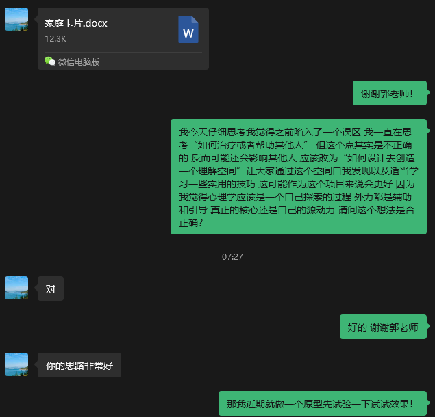 Today, after careful reflection, I realized I had fallen into a misconception. I had been fixated on “how to treat or help others.” But this approach is fundamentally flawed—it might even hinder others. Instead, we should focus on “how to design spaces for understanding” where people can discover themselves and learn practical skills. This might be a better direction for this project, as I believe psychology should be a journey of self-exploration. External forces serve only as guides and catalysts; the true core lies in one’s own intrinsic motivation. Is this perspective correct?