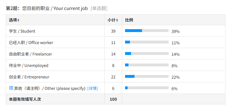 A total of 100 valid responses were collected. The majority of participants were aged 21–26 (65%), with primary occupations including students (39%), entrepreneurs (22%), and freelancers (14%). The sample represented first-tier and new first-tier cities such as Chongqing, Changsha, Shanghai, and Guangzhou.