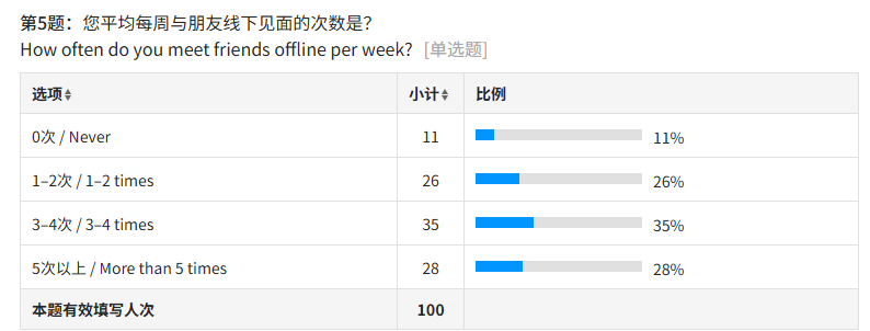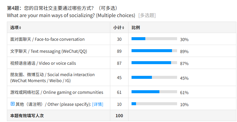 89% of young people primarily communicate through text or video, with offline meetups occurring infrequently (35% meet in person fewer than three times weekly). This indicates that young adults living in major Chinese cities heavily rely on the internet for socializing, lacking genuine face-to-face interaction.