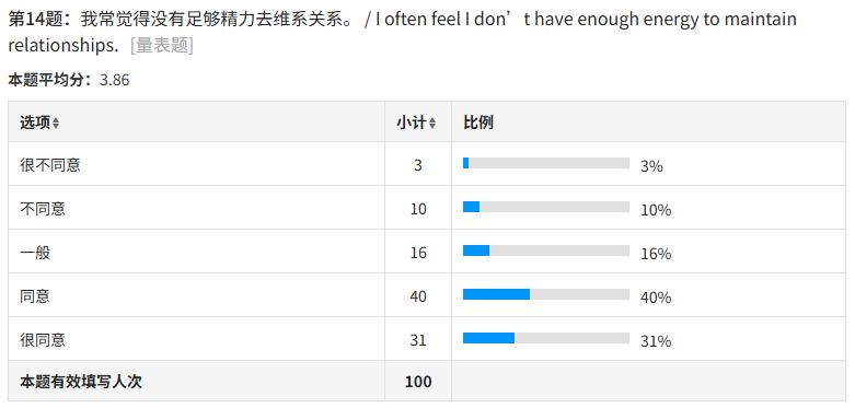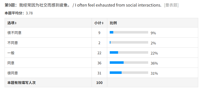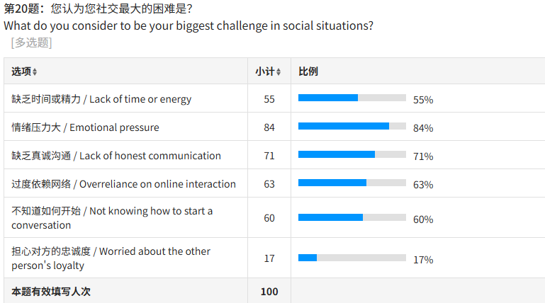 71% reported “not having enough energy to maintain relationships,” 67% felt “socially exhausted,” and 74% admitted that “social issues impacted their studies or work.” 76% fear being judged, 66% feel more relaxed alone, and only 7% consider themselves “proactive initiators.”This indicates that “social fatigue” has become a normalized psychological phenomenon, manifesting either as unwillingness to engage in social interactions or fear of doing so.